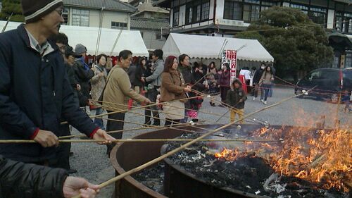 1月12日とんど祭り、宗忠神社は例年のごとく大賑わい。 庭に大規模なたき火を作り、道にまで人の行列ができる。 先を割った竹に餅を挟んで焼き、ぜんざいにしていただく。 おもちもさることながら、付け合せの たくわんのおいしいこと。 きょうはわりと暖…